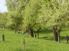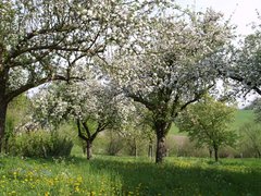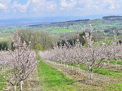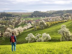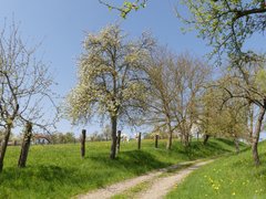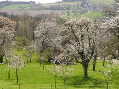 Im Frühling zur Obstbaumblüte ist das Obst-Hügel-Land ein besonders beliebtes Ausflugsziel. Die Baumblüte ist mittlerweile großteils vorüber, vereinzelt blühende Mostbirn- und Apfelbäume kann man noch bewundern.