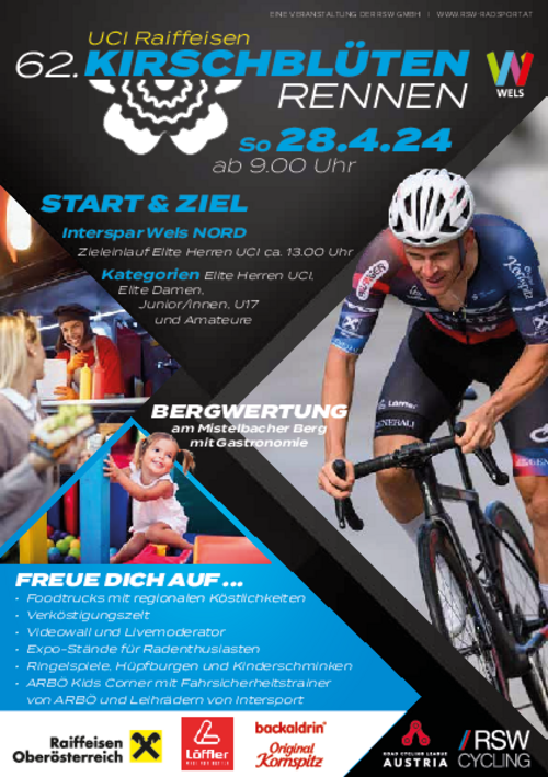 Das Kirschblütenrennen zählt zu den ältesten Radrennen in Österreich. Der Start des Kirschblütenrennens über insgesamt 169,6 Kilometer mit dem Scharfrichter Mistelbacher Berg erfolgt am Sonntag, 28. April 2023 um 09.00 Uhr beim Interspar Wels Nord. Heuer wird ein besonders großes Augenmerk auf die Amateure gerichtet: diese müssen insgesamt 104,1 Kilometer bewältigen. Teilnehmen können ambitionierte Radsportler mit einer Amateurlizenz, einer Eintageslizenz oder Inhaber der BikeCard. Im vergangenen Jahr waren bei diesem Bewerb 160 TeilnehmerInnen am Start. Ein umfangreiches Rahmenprogramm wird das Kirschblütenrennen zu einem großen Radsportfest für die ganze Familie machen.