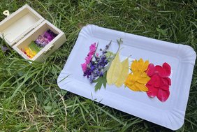 Mit den gesammelten Blättern und Blüten versuchen wir zu malen, färben, basteln und gestalten kleine bunte Kunstwerke. Außerdem lassen wir uns die selbstgemachten Blumenbrote und Blüten-Eistee schmecken.