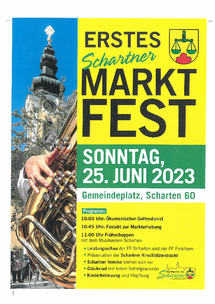 Um 10 Uhr findet ein ökumenischer Gottesdienst statt, um 10.45 Uhr folgt der Festakt zur Markterhebung und am 11 Uhr spielt der Musikverein Scharten beim Frühschoppen.