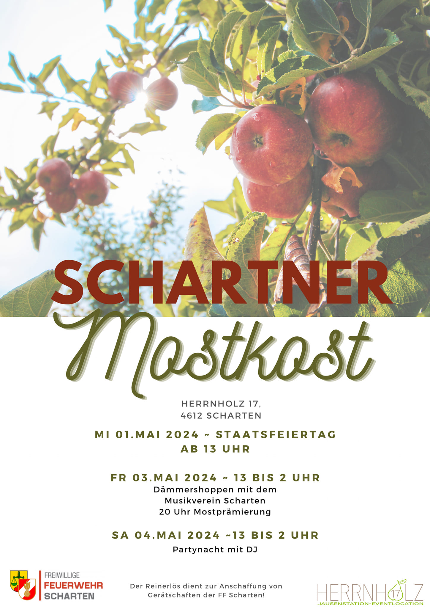 Viel gute Stimmung, köstliche Moste und ein tolles Programm gibt es bei der Schartner Mostkost. Die Schönheit der Natur, das Blühen der Bäume, die Qualität der Moste, Schnäpse und anderer Schmankerl im Obstgarten oder in der Nagelbar erwartet die Besucher:innen. Sie können prämierte Moste der Mitglieder des Schartner Obstbauvereines kosten und eine zünftige Jause der Jausenstation Herrnholz17 genießen. Die musikalische Umrahmung garantiert beste Unterhaltung.