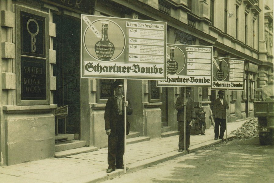 Erstmals um das Jahr 1926 hatte Herr Otto Burger aus Linz im Hoftrakt des Elternhauses eine Getränkeproduktion etabliert. Er war der erste Hersteller der „Schartner Bombe“. Im Dezember 1927 wurde die „Schartner Bombe“ als geschützte Markenbezeichnung ins Handelsregister eingetragen. Die ersten Flaschen hatten tatsächlich die Form einer Bombe. Einige dieser gläsernen, graugrünlichen Bomben haben sich bis heute erhalten. Abgefüllt wurden sie im Presshaus des Schatzmeir-Hofes in Leppersdorf. Fünf ArbeiterInnen bedienten eine halbautomatische Anlage und befüllten 600 Flaschen in der Stunde.