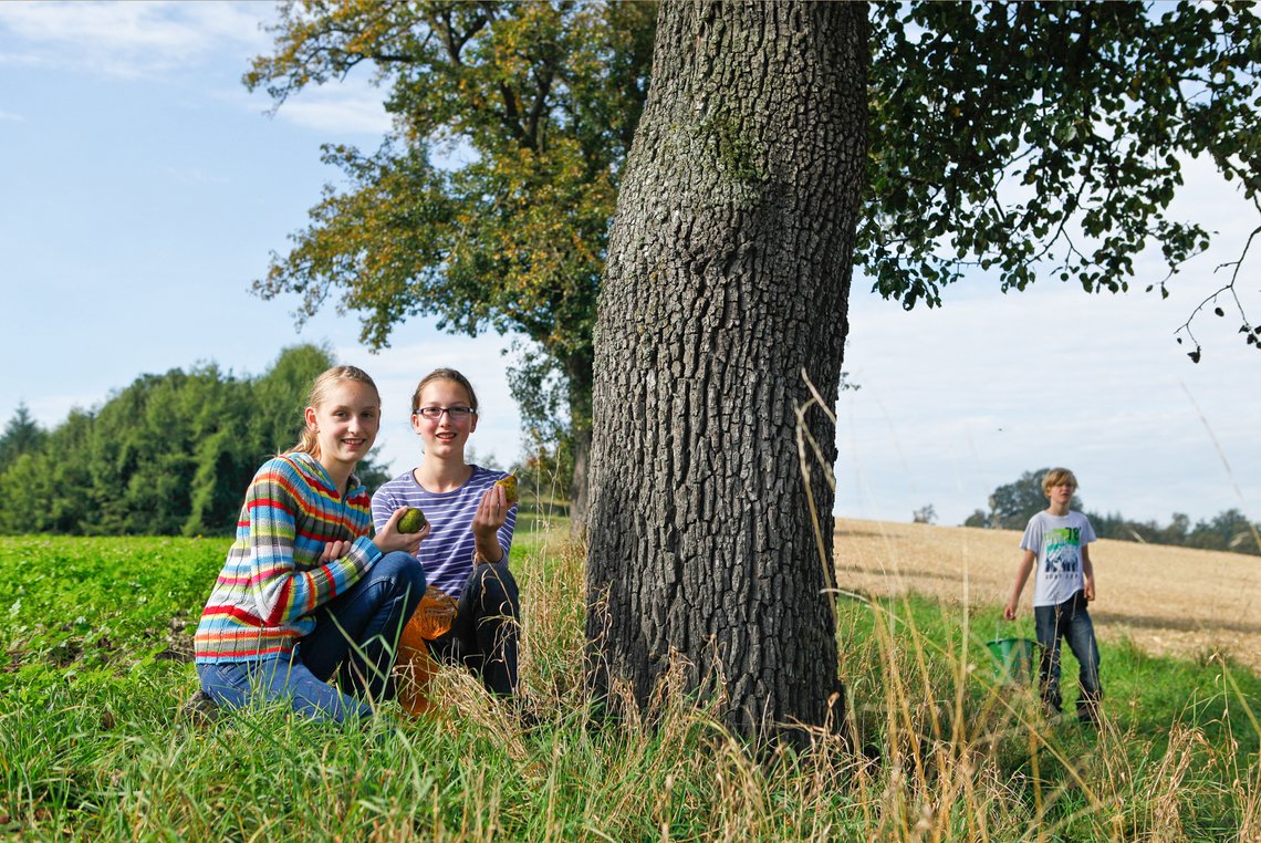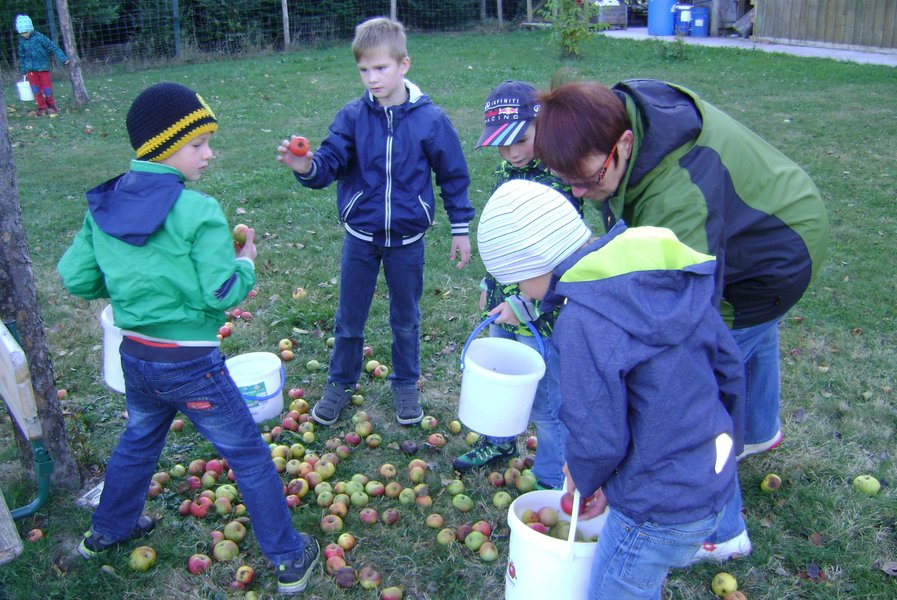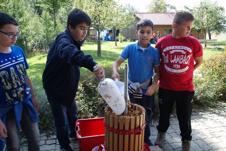Streuobstwiesen im Herbst - das ist die Zeit der Ernte. Die Kinder lernen die vielfältigen Früchte kennen. Gemeinsam klauben sie Äpfel und verarbeiten diese mit einer kleinen Obstmühle bzw. Obstpresse. Der selbst gepresste frische Apfelsaft darf natürlich gleich verkostet werden. Bei der Herbst-Exkursion gehen die NaturvermittlerInnen auch darauf ein, wie sich Bäume, Wiesenpflanzen und Tiere auf den Winter vorbreiten.